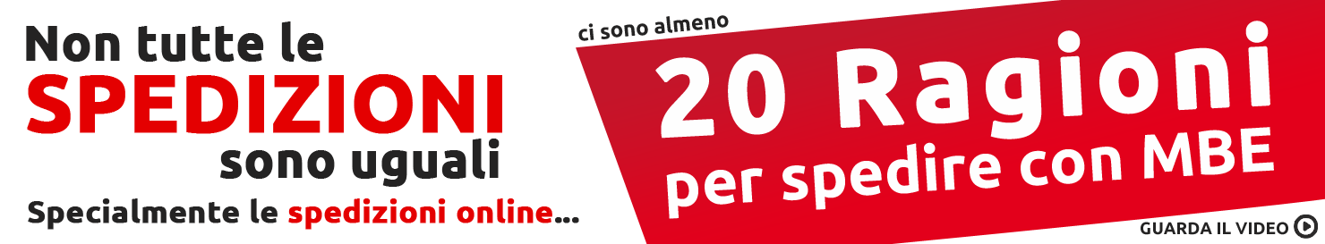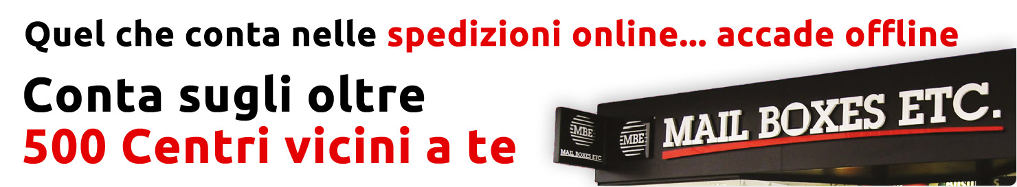 I Centri MBE sono gestiti da Affiliati imprenditori indipendenti che operano sotto il marchio MBE per effetto di un contratto di franchising. Mail Boxes Etc. svolge, attraverso la sua Rete di negozi in franchising, servizi di supporto alle imprese e ai privati. I principali servizi offerti sono quelli di logistica e spedizione, svolti grazie ad accordi, a favore degli Affiliati stessi, stipulati da MBE con i principali corrieri espresso nazionali ed internazionali, e di grafica e stampa, svolti sia direttamente che attraverso accordi con grandi centri stampa. La promozione dei servizi MBE ad imprese e privati avviene grazie all'attività commerciale svolta dall'Affiliato MBE sia all'interno che all'esterno del punto vendita (farming), fattispecie, quest'ultima, che rappresenta specifica obbligazione contrattuale a carico di ciascun Affiliato. Mail Boxes Etc. e MBE sono marchi registrati e utilizzati per concessione di MBE Worldwide s.p.a. (tutti i diritti sono riservati). Non tutti i servizi e i prodotti offerti da Mail Boxes Etc. sono disponibili presso ciascun Punto Vendita MBE. Il materiale proveniente dal presente sito, le informazioni ed i dati in esso contenuti non possono essere copiati, distribuiti, modificati, ripubblicati, riprodotti, scaricati o trasmessi a terzi con qualsiasi mezzo, senza il precedente consenso scritto di Sistema Italia 93 S.r.l. Si declina ogni responsabilità con riferimento all'impiego non autorizzato del materiale, delle informazioni e/o dei dati contenuti nel presente sito.